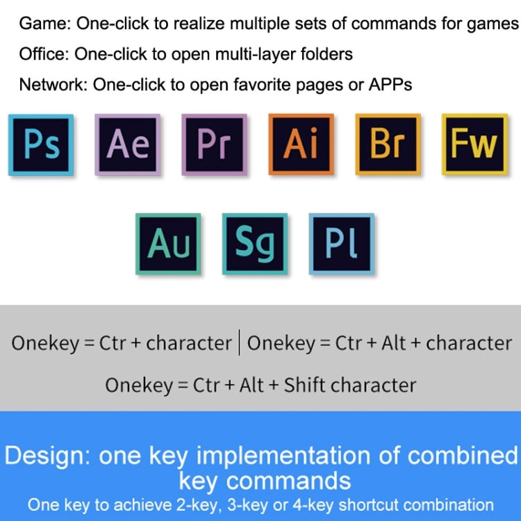 7. Game: One-click to realize multiple sets of commands for games; Office: One-click to open multi-layer folders; Network: One-click to open favorite pages or APPs; Design: One-click to realize combination key commands