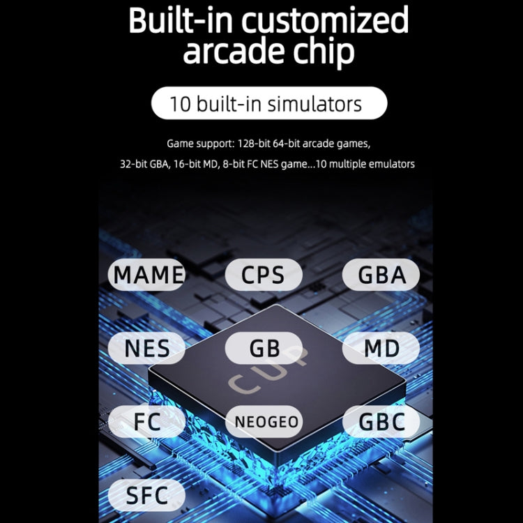 13. Built-in customized arcade chip, built-in 10 emulator games support: 128-bit 64-bit arcade games, 32-bit GBA, 16-bit MD, 8-bit FC, NES games