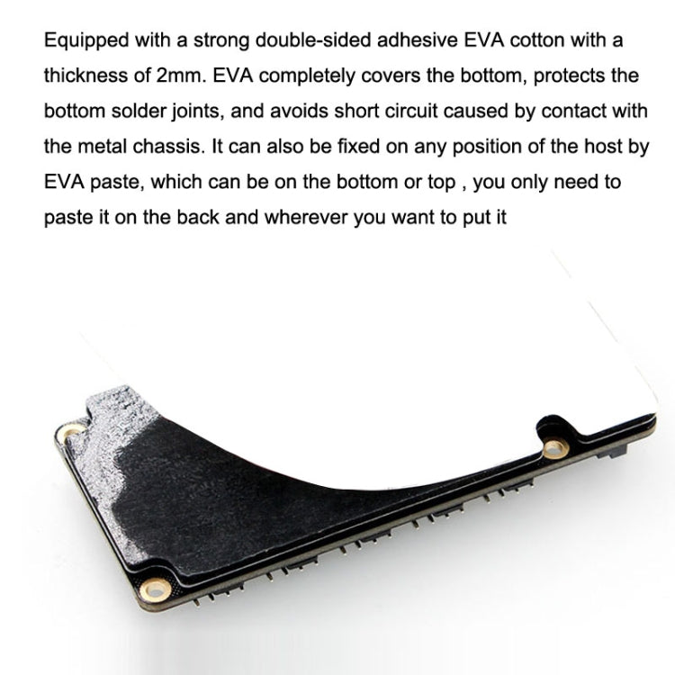 6. Equipped with a strong double-sided adhesive EVA cotton with a thickness of 2mm. EVA completely covers the bottom, protects the bottom solder joints, and avoids short circuit caused by contact with the metal chassis. It can also be fixed on any position of the host by EVA paste, which can be on the bottom or top , you only need to paste it on the back and wherever you want to put it