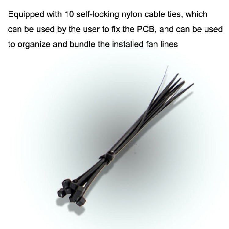 10. Equipped with 10 self-locking nylon cable ties, which can be used by the user to fix the PCB, and can be used to organize and bundle the installed fan lines