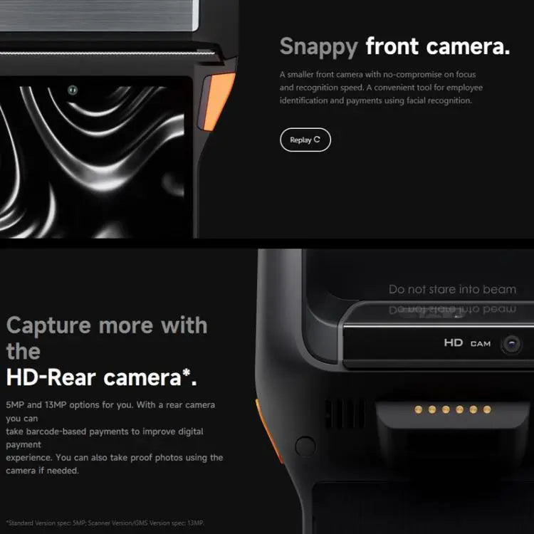 - Standard version: rear: 5MP AF + flash, support 1D/2D code recognition