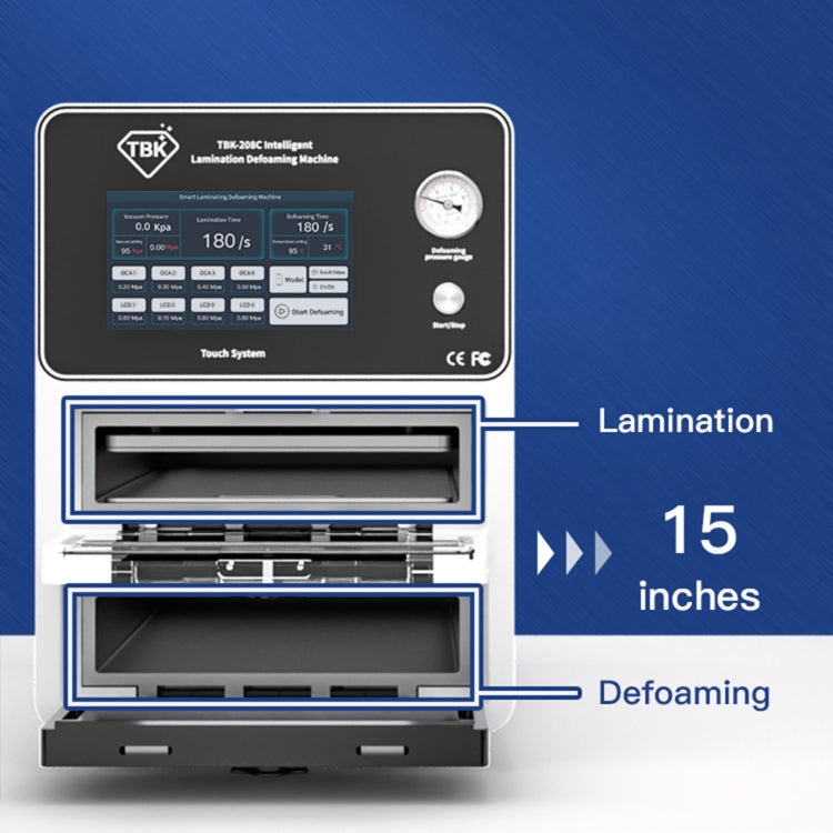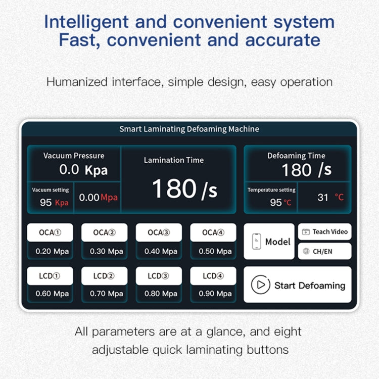 1. Intelligent lamination and defoaming integrated machine, 125mm large rod cylinder, the four guide rods fit smoothly, 15-inch large capacity integrated warehouse