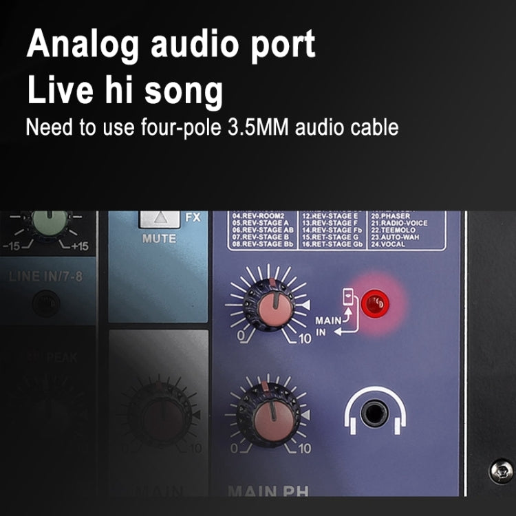 6. Output: STEREO OUT: 2, PHONES: 3.5MINI headphone output: 1, 3.5MINI mobile phone live output