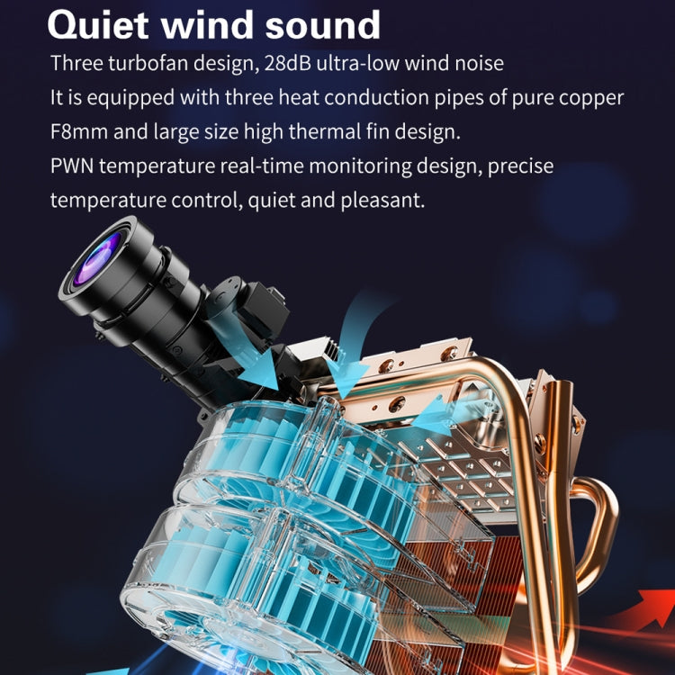 8. Three turbo fans design, 28dB ultra-low wind noise, with pure copper F8mm three heat pipes + large size high thermal conductivity fins design, using PWM real-time temperature monitoring design, precision adjustment of temperature control, quiet and pleasant