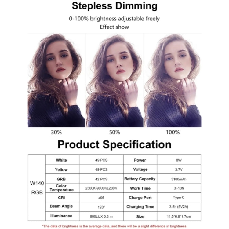 1. RGB LED video light adopts 140 lamp beads. RGB 0-360 degree full color, 2500-9000K color temperature control, dimmable brightness zero to 100 percent