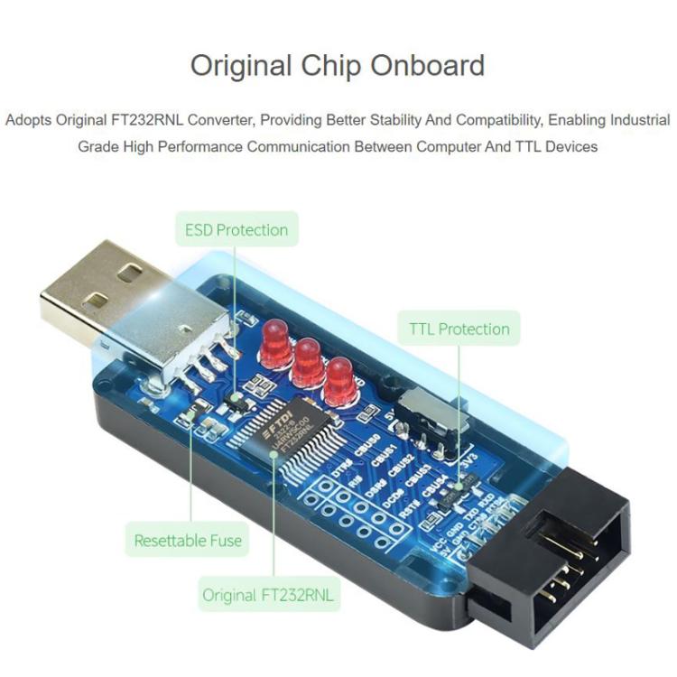 1. Utilizing the original FT232RNL chip, it offers better stability and compatibility, enabling seamless industrial-grade high-performance communication between computers and TTL devices