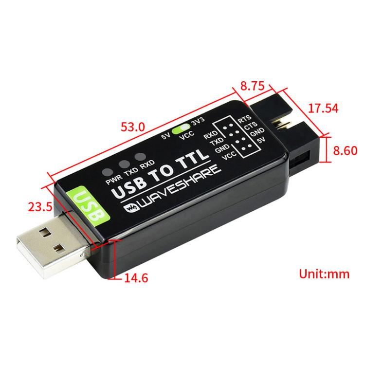 9. Note: this product does not come with a USB cable. This module is a USB-to-TTL level converter. Do not directly connect to RS232 level to avoid damaging the module