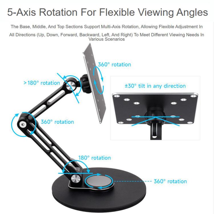 2. 5-axis linkage, viewing angle switching, base, center and top can be rotated in multiple axes, to achieve up and down, front and back, left and right flexible adjustment, to meet the viewing needs of different scenarios