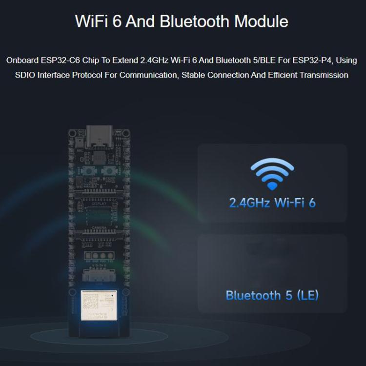 9. Onboard ESP32-C6 chip extends ESP32-P4 with 2.4GHz Wi-Fi 6 and Bluetooth 5/BLE. Communicates via SDIO interface protocol for stable connections and efficient data transfer