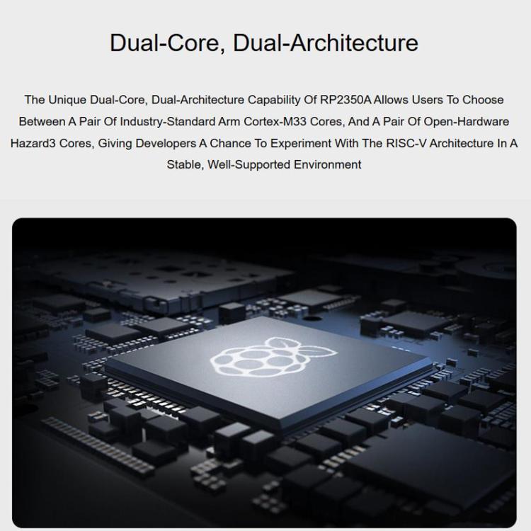 2. Unique dual-core, dual architecture, equipped with dual-core ARM Cortex-M33 processor and dual-core Hazard3 RISC-V processor, the clock running frequency are up to 150MHz, to support the user in the two architectures to switch between the flexible