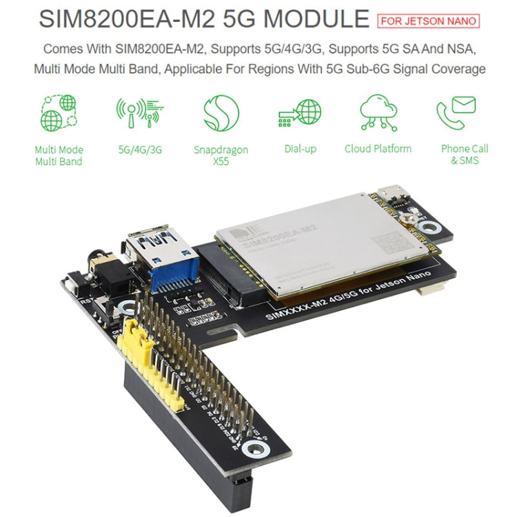 This 5G/4G/3G Jetson Nano communication module adopts SIMCom 5G module SIM8200EA-M2, supports 5G NSA and SA networking, providing data rate up to 2.4 Gbps (DL) / 500 Mbps (UL).