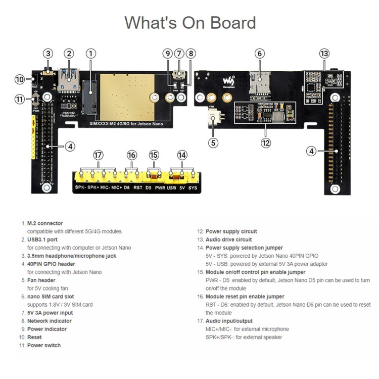 The base board features standard M2 connector, allows connecting with different 4G or 5G communication module in M2 package. There are also onboard interfaces like USB3.1 port, audio jack, SIM card slot, etc. Combined with our configuration script and development resources, it is easy to enable 5G high speed communication for the Jetson Nano or computer. This 5G module is ideal for fast evaluating 5G modules, as well as being integrated into sorts of applications where 5G connection is required.